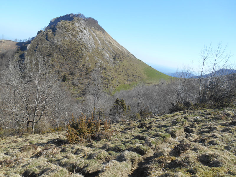 Entre les rochers, nous atteignons le Soum du Prat du Rey et poursuivons la crête vers des pylônes, il s'agit de chercher l'endroit pour descendre, car aucun sentier n'apparaît. Les pentes herbeuses raides sont traversées en zigzag, évitant ainsi la forte pente. Ce qui nous amène au col.
