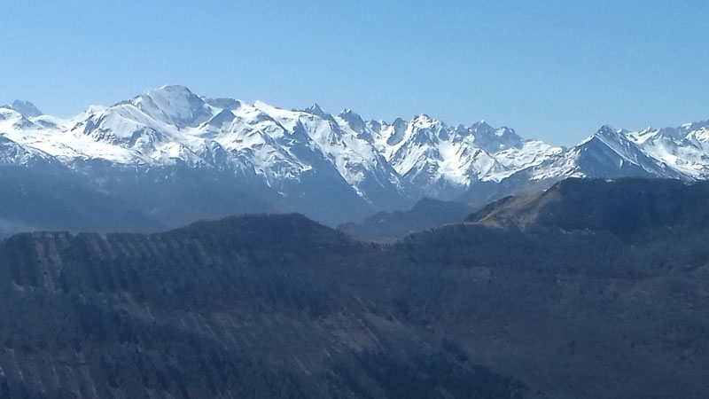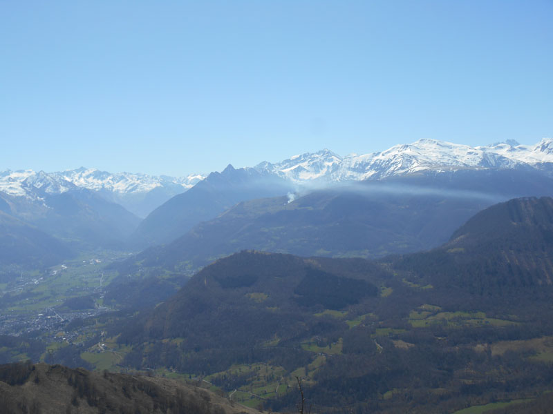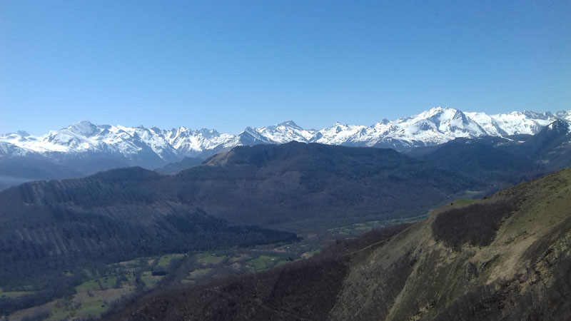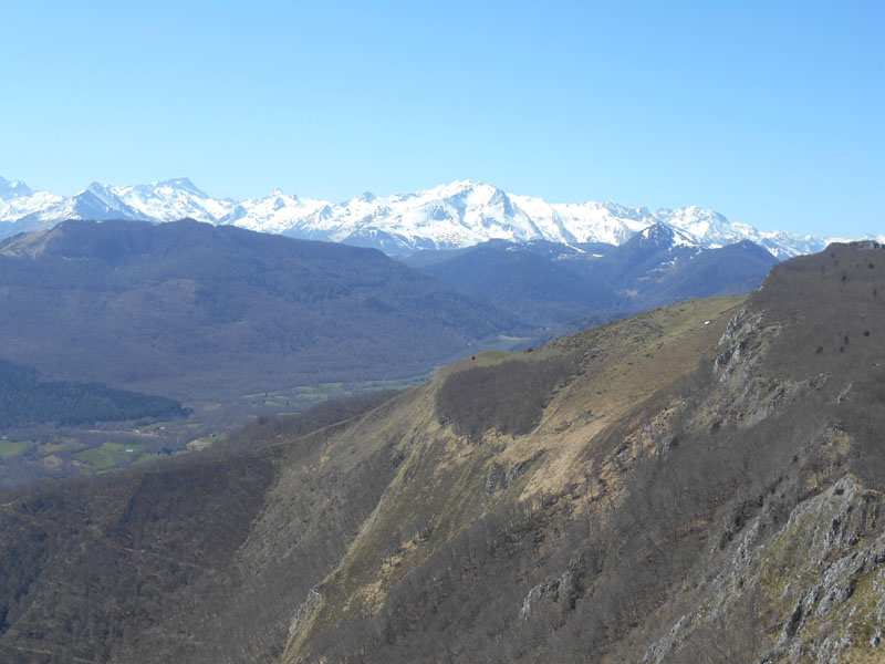 Retour au col et c'est vers le sud que nous suivons le sentier du col d'Andorre, qui traverse le bois de hêtres. Nous attaquons les pentes herbeuses, au sud, pour parvenir sur la crête du Soum de Prat du Rey. La vue sur les cimes blanches est splendide. Viscos, Cabaliros, Astazous, pic du Midi d'Arrens, etc.