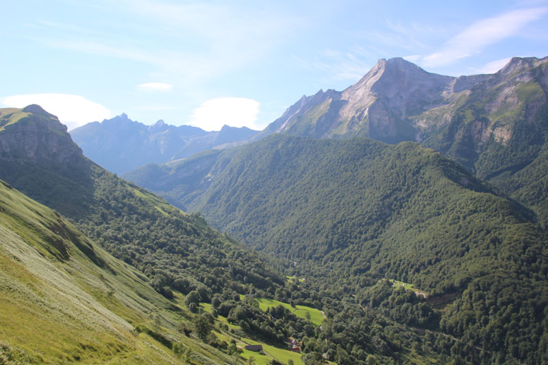 Départ 8 h 30, avec Andrée, Fabien et Ludovic, direction les Eaux-Bonnes, puis Aas. 9 h 55, nous prenons un sentier qui s'élève en lacets vers le nord-est, puis le sud. Très vite nous enlevons un vêtement du fait de la chaleur, malgré de nombreux nuages. Le rythme est régulier, le sentier par endroit, boueux. A l'ouest se détachent le Turon de Sesques , le massif de Sesques, les Cinq Monts, en bas parait les Eaux Bonnes et au loin s'étale Laruns.