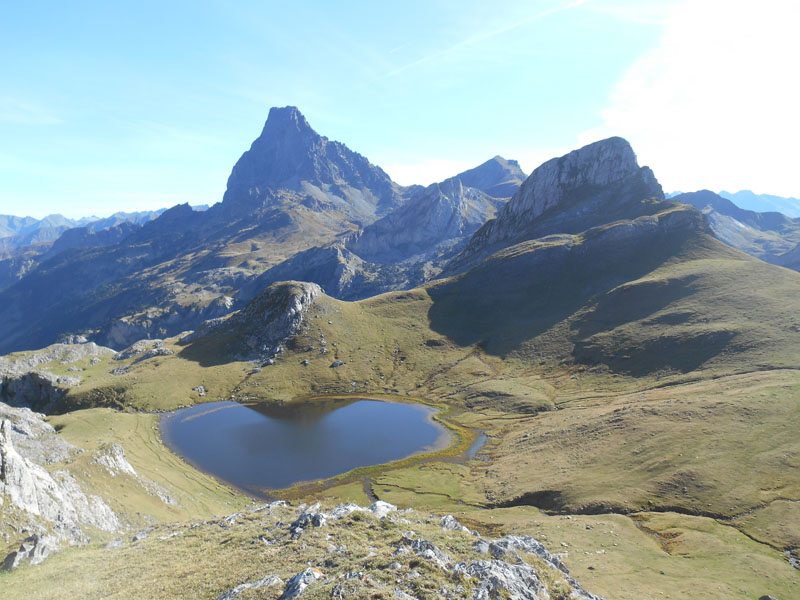 Une montée raide nous dépose au col des Moines, à 11 h 30. La vue est superbe. Le pic du Midi d'Ossau dominera toute la randonnée. Un ensemble de sommets se détachent des crêtes : Peyreget, Caillabet de Rebec, pics d'Astu, Paradis, Castérau, Bielle et coté espagnol pic de Belonseiche et Ibon des Escalar, à ses pieds.