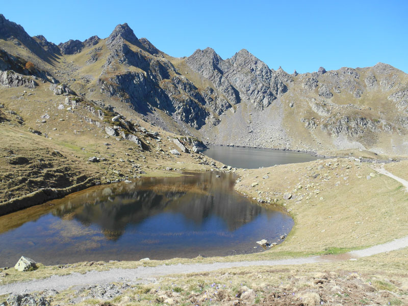 Le cheminement passe au-dessus du lac de Miey (1947 m.), plus modeste, mais qui ne manque pas de charme. Le lac Roumassot (1845 m.) offre un cocktail de reflets. C'est une succession de perles de lacs. La descente dans le bois parait interminable. Enfin nous arrivons au pont de Bious. La piste est moins pentue et amène au parking de Bious Artigues dans la fraicheur d'un soir d'automne, à 18 h.