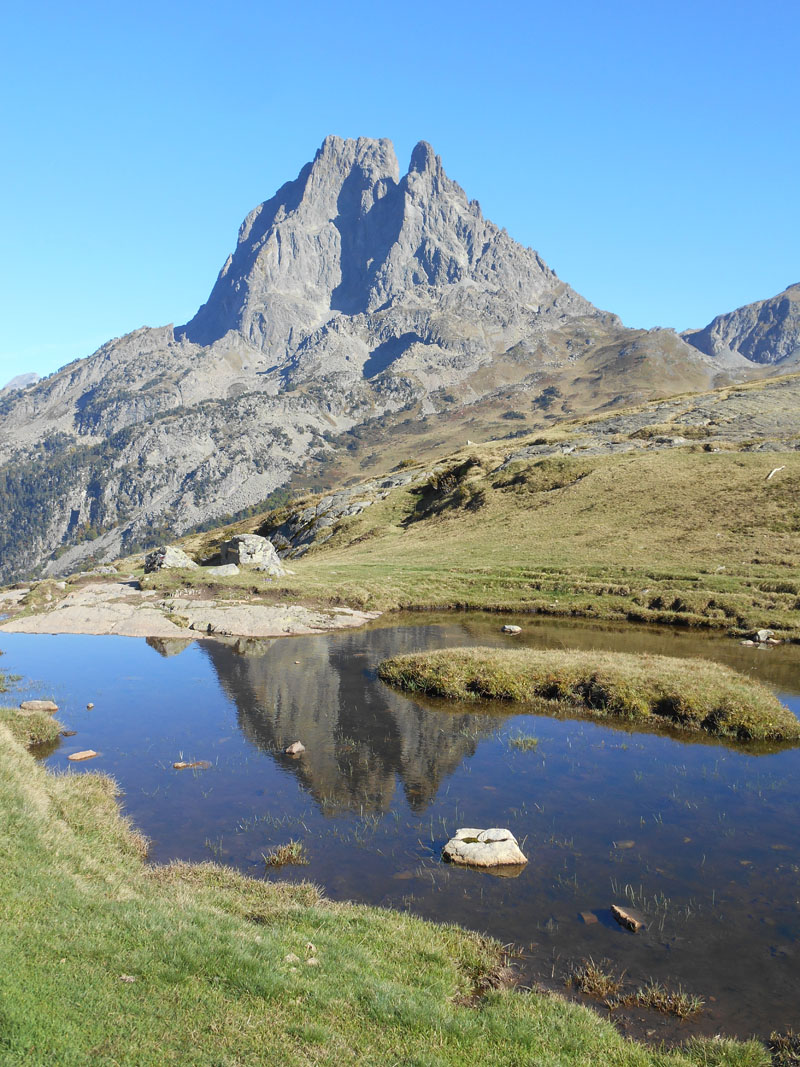 Regroupés au col de Bielle, nous effectuons une boucle par le lac Bersaut, où plonge le reflet du pic Castérau. C'est en passant au bord du lac Gentau que le reflet du sommet mythique expose toute sa majesté. Des travaux sont effectués au refuge d'Ayous (1982 m.)