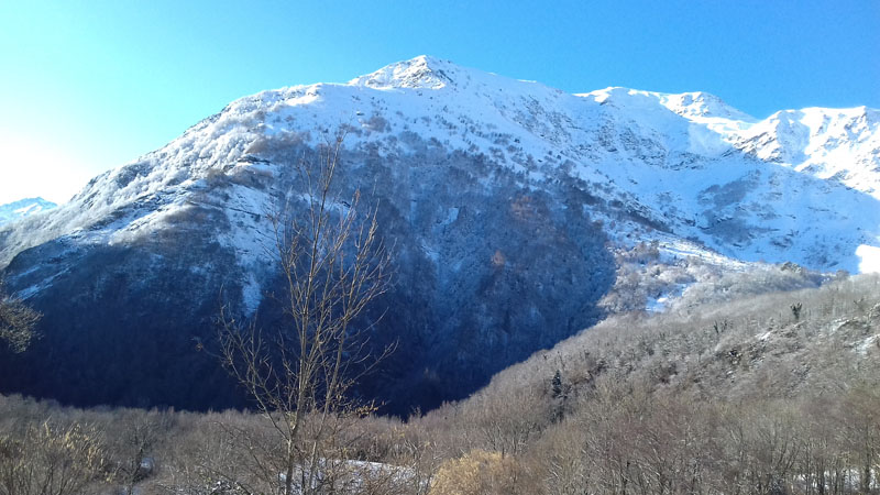 A partir de là, le chemin grimpe à l'ouest dans les bois, par une pente raide et boueuse, côtoyant quelques granges. Puis c'est l'arrivée dans les secteurs Coume d'Oussau et Coume de Bernadets (1337 m.), entièrement couverts de neige.