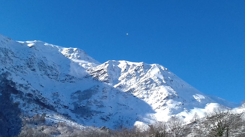 9 h, les deux groupes s'engagent vers le village de Uz (750 m.) plus au sud, puis près de la chapelle de Pouyaspé (956 m.), où nous pouvons admirer, les cimes enneigées à l'est, de Hautacam, pic du Midi de Bigorre, Soum et pic Léviste, etc.
