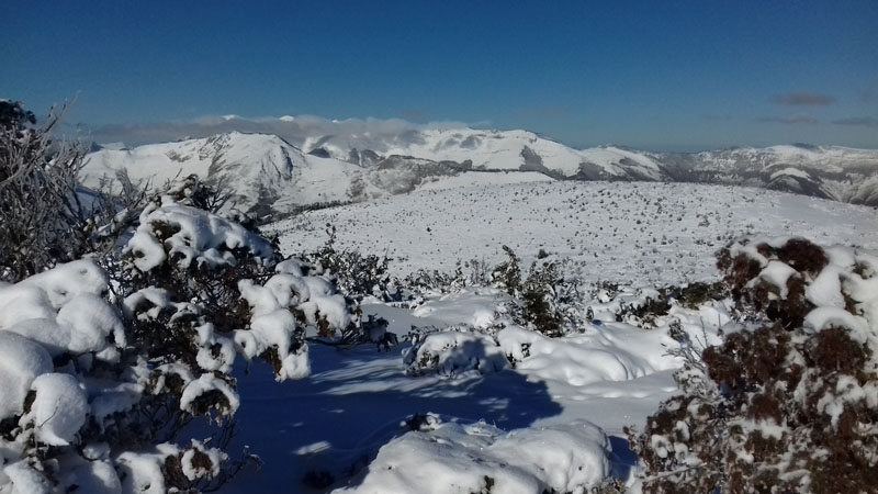 Le froid saisit la plupart d'entre nous. Alors nous nous nous lançons sur la crête ouest, pour nous rendre au Turon de Bène. Je m'engage à tracer le cheminement dans la neige. Le paysage est toujours magnifique et au nord se dessinent les crêtes de la vallée d'Azun. Au sud, face à nous , s'impose le massif du Cabaliros dans ses écharpes de neige.
