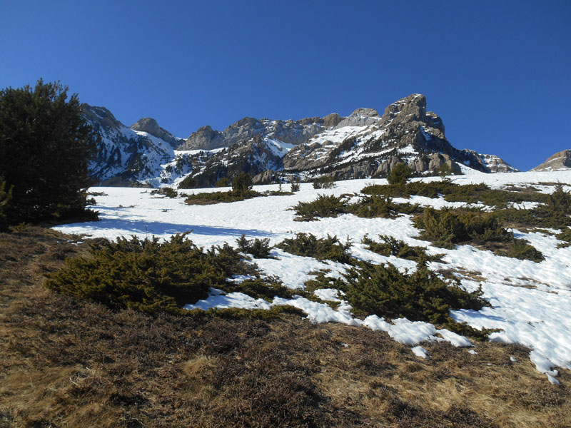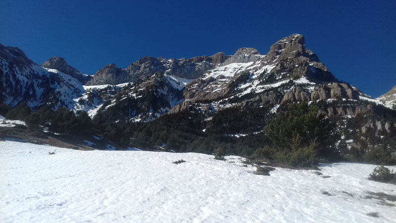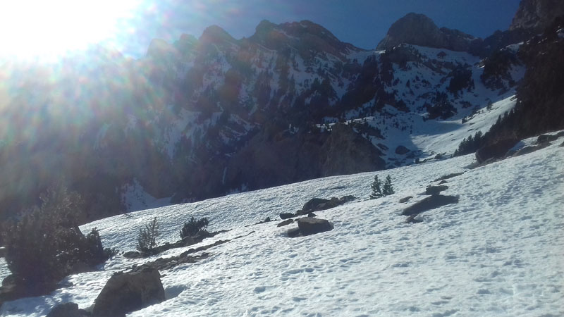 Nous poursuivons sur les pentes ouest. Le soleil brille au-dessus des cimes : Peña Blanca, Peña Telera, Sierra Derra Partacua, Corana Mallo. Tantôt vers la droite, tantôt à gauche, nous cherchons le cheminement sur des pentes neigeuses de plus en plus gelées. Au loin, dans un rocher nous remarquons un trou béant, c'est l'Arche de Sarronal. Non équipés de crampons et piolet, il est imprudent de poursuivre. D'ailleurs un couple de randonneurs retourne sur leurs pas, tout en glissant à chaque instant.