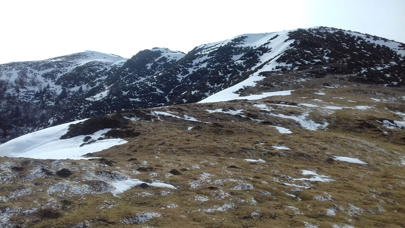 Le trajet se poursuit plein sud, alors que le ciel se voile. Encore un petit sommet dépassé (1221 m.), alors que le sentier se dirige sud-est, pour parvenir à un genre de col (13 m.) en partie couvert de neige. Il est 12 h 40. Le Soum des Lits, très enneigé est encore à vingt minutes.