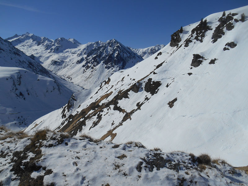 L'ascension au nord s'effectue sur des pentes toujours raides mais en multipliant les conversions. Face aux sommets comme le Soum de Mouterra, le pic de Barbe, le pic de Bédéra, nous remarquons une large surface, l'emplacement du lac de La Lahude, couvert d'une épaisse couche de neige.