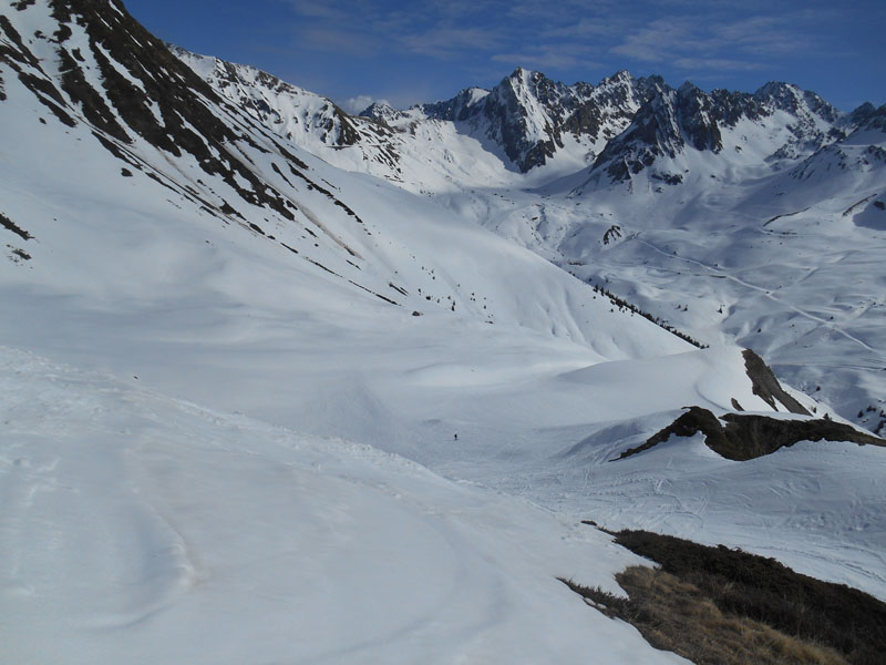 Nous glissons vers le sud-ouest, en quelques virages serrés, pour atteindre la piste du Tourmalet. Lancés comme des flèches, nous filons à grande vitesse, évitant quelques randonneurs, et arrivons ainsi en bout de piste à 14 h 45.