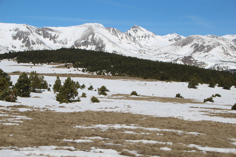 Une longue descente enneigée amène sur un plateau, à 2088 m. Au loin au sud, nous observons la magnifique chaîne de montagne toute blanche. Les pentes sont légères sur l'immense plateau de la Calme fait de contrastes de neige, de pins, de cimes lointaines dans un panorama sublime. A l'ouest se dessinent le Puig de Carlit, le Puig Oriental de Coll Roi, etc.