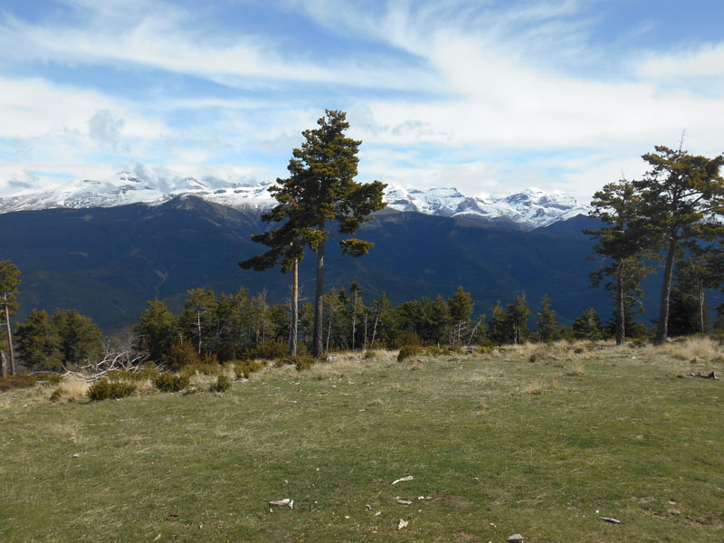 Nous longeons le Monte San Salvador, avec la Peña de Castillon. La crête descend dans le secteur La Contienda à 1467 m. Les cimes blanches, au nord, sont splendides, Collarada, Pico Somola, Peñas del Rincon, Cirque de Gavarnie, Mont Perdu portant une coiffe de nuages.