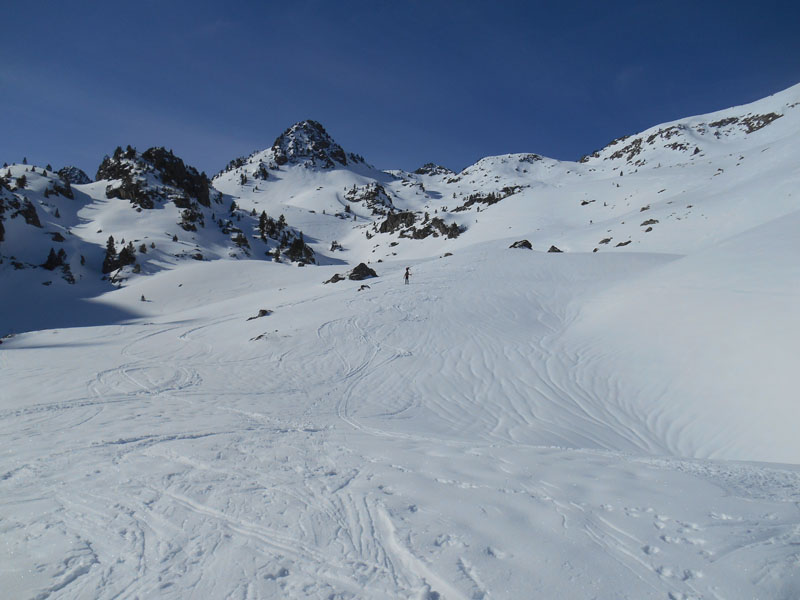 Dans le vallon de Campana, les pentes sont plus douces et bien ensoleillées. La direction est au sud. Au fond la crête de la Pègue ferme l' horizon. Le vallon est décoré de rochers et de sapins. De petits groupes s'orientent vers la crête de la Pègue.