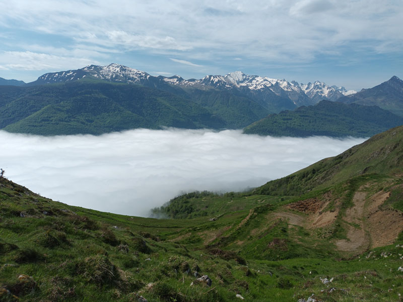 La piste sillonne grimpant sur la pente herbeuse. Des sentiers raccourcissent le parcours. La mer de nuages, toujours épaisse masque toujours la vallée. Les cimes surgissent, comme des ilôts géants, Cabaliros, pic du Midi d'Arrens, les Gabizos, le Balaïtous et bien d'autres.