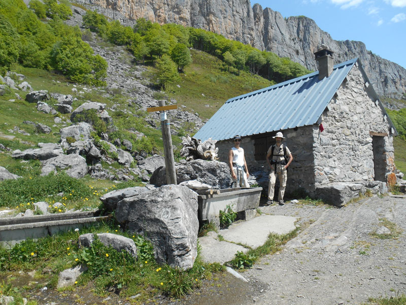 Une remontée entraîne sur un vaste vallon herbeux, hors de la forêt. Des ruisseaux et zones humides sont à traverser. Puis nous arrivons à la petite cabane de Boué. Bien équipée, elle loge le berger, pour la saison de transhumance. A côté un abreuvoir et une source offrent de l'eau fraîche.