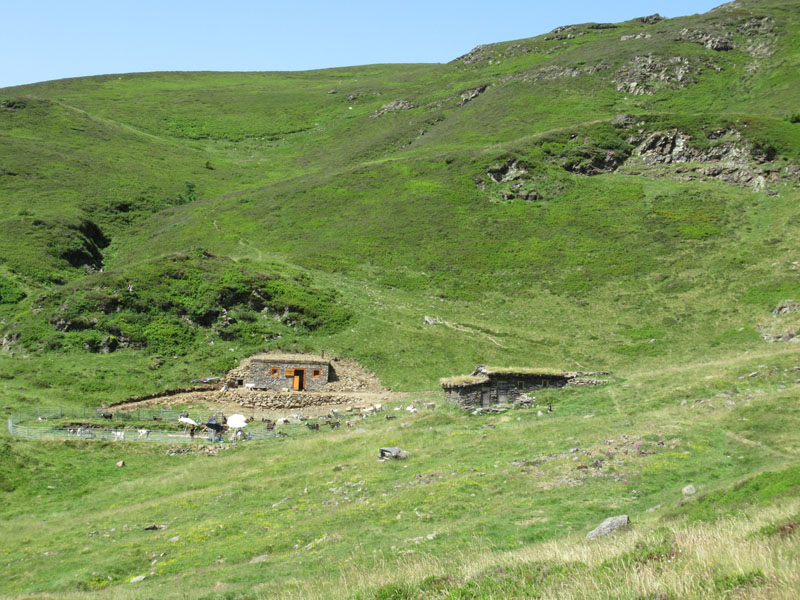 Le sentier peu à peu vire à l'ouest. Il traverse des champs de fougères. Gare aux tiques ! D'autres passages rocheux sont plus sportifs. Près d'un col, nous dominons les cabanes du courtaou deBénaquès. Clôturé, le courtaou abrite un troupeau de chèvres. Nous visitons une des cabanes de pierre, mieux équipée, pouvant servir de refuge.