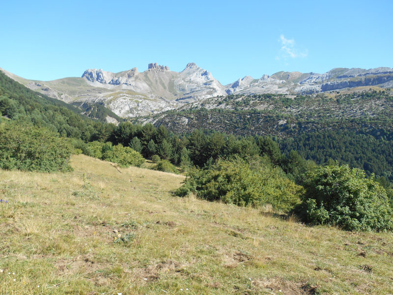 La descente s'effectue par le même passage. Du col nous bifurquons au nord et cherchons un passage dans le bois, où les sentiers sont envahis par la végétation. Un sentier à droite monte dans les lapiaz, pour arriver au Pico Carniceras. Une mini-maisonnette, pouvant servir de boîtes aux lettres, est fixée sur un piquet.