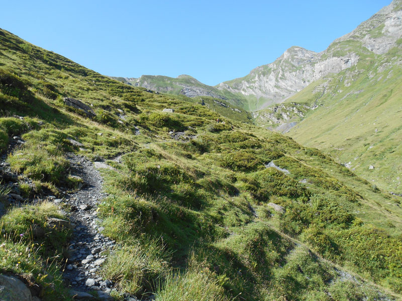 La montée est raide, puis descend. Nous avons des doutes sur le bon trajet. Une randonneuse que nous croisons confirme l'erreur. Revenus sur nos pas, au croisement, nous prenons le sentier sud-est. La montée est raide dans le secteur Ribère de Bué. Depuis 2 semaines le beau temps s'est installé et la chaleur monte de jours en jours.