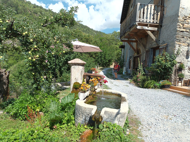 La piste se transforme en sentier qui s'accroche contre des falaises d'une dizaine de mètres, sur la droite et un ravin à gauche, d'où, par endroit, nous voyons la vallée ; route et rivière. Trente minutes près, dans un joli hameau, perché, une fontaine ornée de fleurs, trois maisons, décorent le lieu.