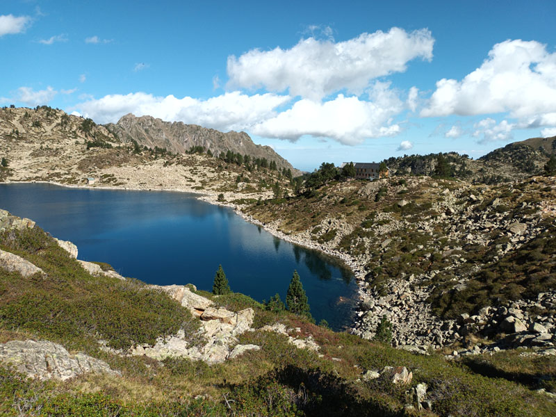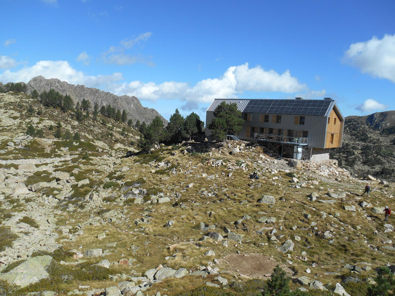 Nous bifurquons au sud-ouest par le sentier pentuqui amène au refuge récent, flambant neuf, de Campana de Cloutou. Le nouveau et grand refuge possède deux grandes façades métalliques et deux autres en bois, ainsi qu'une vaste terrasse.