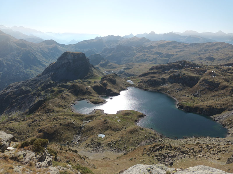 Le pic du Midi d'Ossau reflète sa haute silhouette dans le lac Gentau, aux eaux cristallines. Le circuit se poursuit par les Laquets d'Ayous, au sud, suivis par une remontée au col et le bassin où s'étend le vaste et magnifique lac Bersau ( 2103 m.). Alors les massifs se reflètent dans les eaux claires.