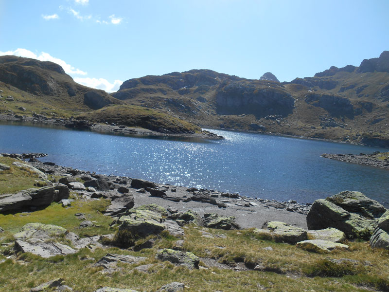 Le trajet rencontre le premier lac : Roumassot ( 1845 m.), belle étendue d'eau, à la surface lissée par un vent léger. Dans des éclats de lumières, le soleil surgit du sommet de l'Ossau, projetant ses rayons comme des faisceaux foudroyants. Le lac du Miey (1947 m.à), plus discret ressemble à une grande piscine.