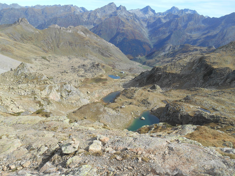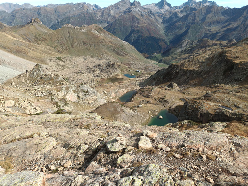 Nous descendons au col de Peyreget (2320 m.). Le sentier tombe raide à l'est vers Pombie. Alors nous abordons trois jolis lacs, placés en étage. Nous longeons ce dernier. Comme un disque tombé du ciel, le soleil surgit du fond du lac par son éblouissant reflet. Le spectacle est lumineux !