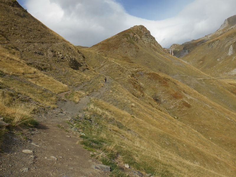 La descente continue sous les rafales de vent, tout en abordant avec prudence les passages exposés au-dessus des ravins. Parvenus à la cabane d'Aule, coupé par les crêtes, le vent faiblit. Nous suivons un sentier sud, sud-est , à droite du gave d'Aule. L'arrivée à Bious Oumette est surprenante par la douceur du climat. Nous rentrons sous les nuages et la lueur du soleil.