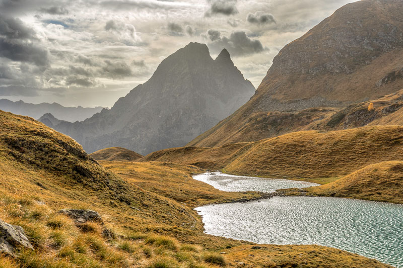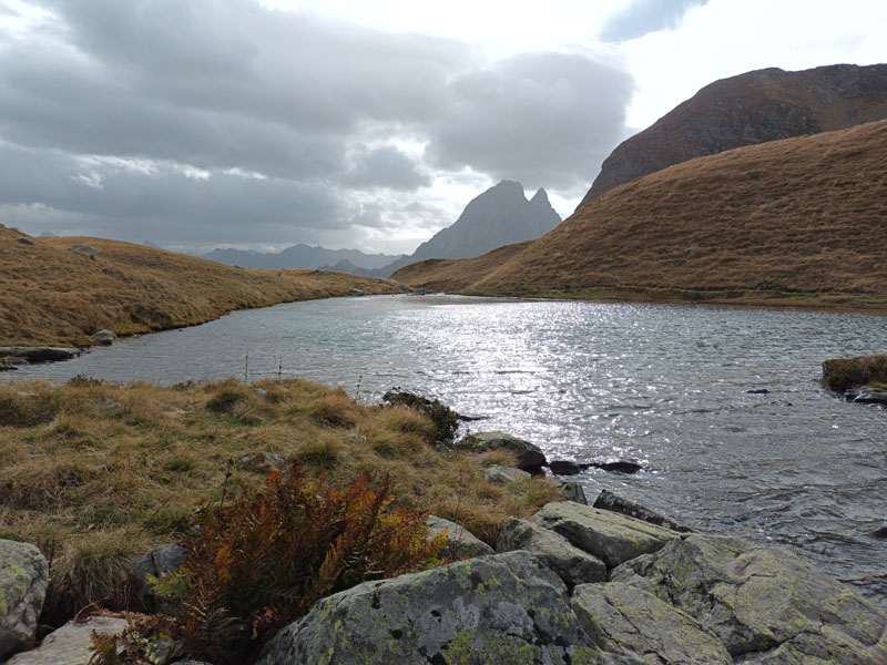 Nous franchissons une petite crête, balayé par un vent très fort. Alors nous descendons sur le vaste lac d'Aule. Le lac est formé en deux parties, séparés par un étranglement, que l'on traverse sur des rochers. La vue est superbe, malgré les nuages et la luminosité faible. Le pic du Midi d'Ossau surgit crevant les nuages. La crête des Moundelhs découpe le ciel sombre.