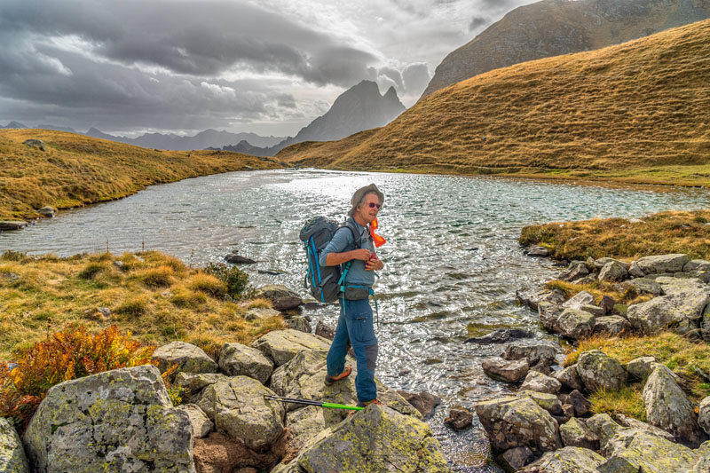 Bousculé par le vent Ludovic effectue une chute acrobatique, sans conséquence, mais il perd le cache de son appareil de photos, qu'il retrouve un peu après dans l'eau. Nous contournons le lac par les sud et grimpons à travers les pentes herbeuses, entre le Turon Garié, à l'ouest, le Soum d'Aas, la crête de Las Bécquottes et pic d'Aulieu, au sud.
