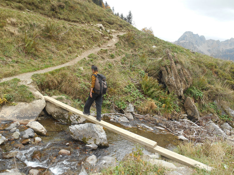 Le chemin suivi sur le flanc nord, redescend au sud et engage à traverser le ruisseau sur des cailloux pour remonter à la cabane d'Aule ( 1800 m.). Ensuite le sentier s'élève juste au-dessus du ravin. Il ne s'agit pas de glisser ! De plus l'endroit est parsemé de gouffres.