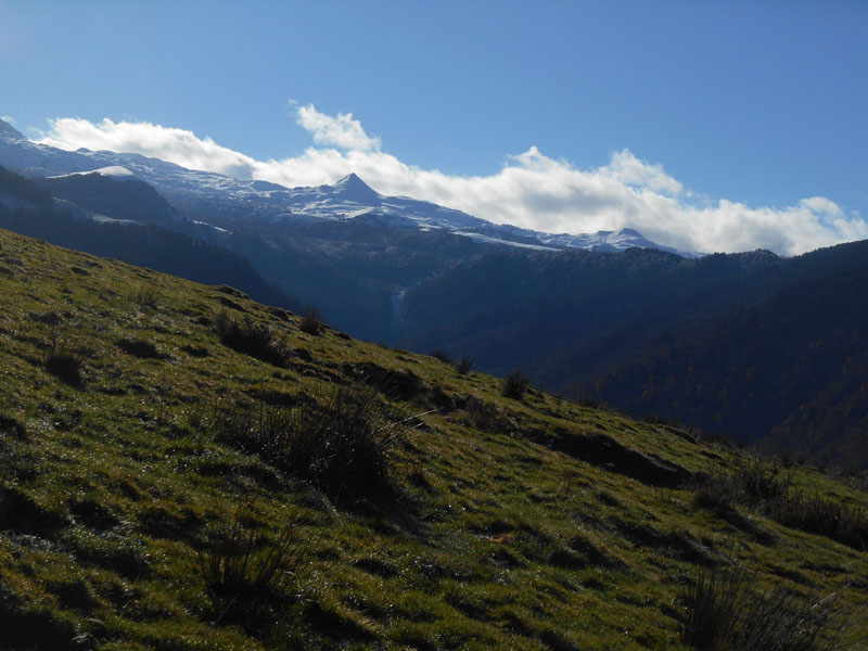 Le pic d'Arlet, le pic d'Anie, plus à l'ouest le pic Soulaing, éclatent de lumière blanche. Un chien Labrit nous suit gentiment. Mais ce n'est pas un labrit de jardin ! Nous descendons vers la cabane et cette fois-ci nous allons suivre la piste.