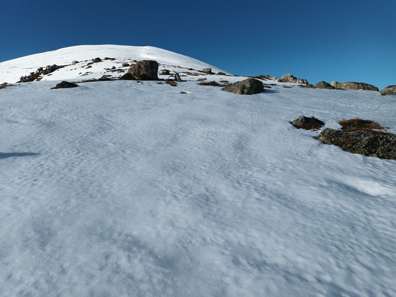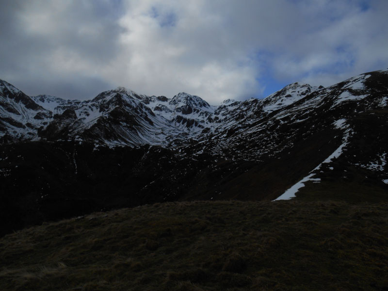 Les cimes se dégagent des nuages. Paraissent le Casque du Lhéris, la crête de Bassias, Pène Lounque, le pic du Midi de Bigorre, la Montagnette, etc. Après une succession de descentes et de montées, le cheminement s'élève dans des pentes neigeuses. Gilbert R. fait la trace, ensuite je prends la relève, puis c'est Gabi qui marque son empreinte jusqu'au Liset de Hount Blanc que nous atteignons ensemble, à 11 h 55.