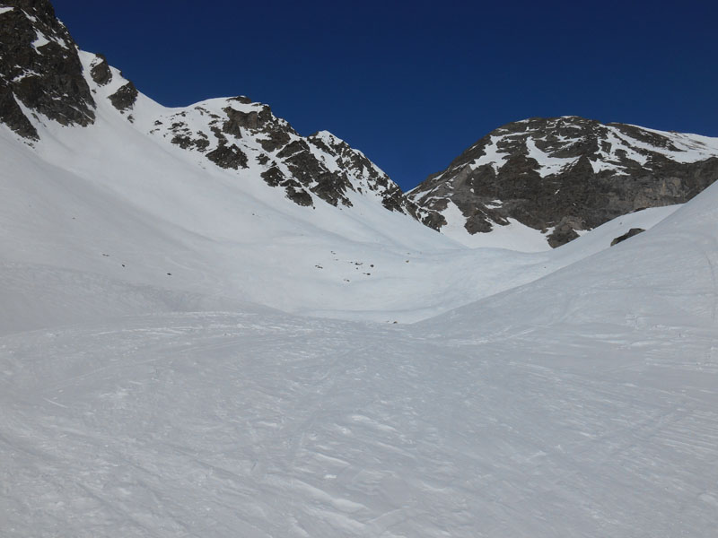 Nous replongeons dans la descente, à la recherche d'une bonne neige, que l'on trouve de temps à autre. Mais, même après la cabane d'Aoude, la neige constitue un parcours d'équilibriste, notamment dans la pente qui tombe vers le goulet.