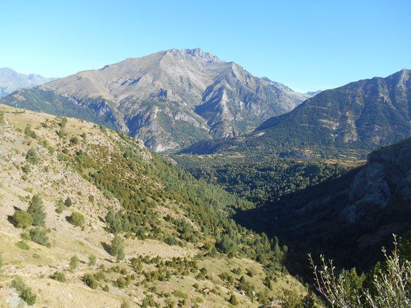 8 h 30, le chemin traverse le pont sur le rio Bolàtica. La fraîcheur surprend , mais l'astre solaire baigne dans un beau ciel bleu. Le sentier monte dans un bois au sud. Lorsque nous en sortons un vaste vallon herbeux s'ouvre, m'étant en évidence les cimes et massifs des alentours, la Tendenera et à l'ouest la Tenera.