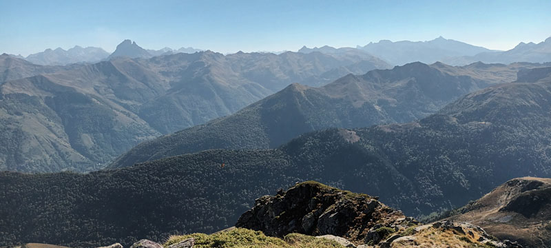 Une montée rapide dans les rochers à l'est amène au pic de Labigouer. Les montagnes à l'est, mettent en évidence le pic du Midi d'Ossau, le Palas, le Balaïtous, toute une chaîne de la Petite Arcizette aux pics d'Enfer. C'est sous cette vue panoramique, que nous déjeunons baignés de soleil. Des vautours tournoient entre cimes et abîmes et disparaissent dans les courants ascendants.