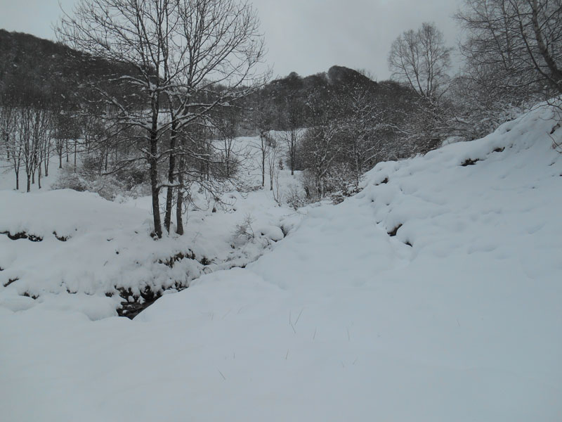 Cependant après le Passage de Hountas et le pic de Saussé, nous parvenons sur un semblant de sentier où le ski reprend ses droits. Des virages sont négociés et entraînent à la sortie du bois. La piste retrouvée nous skions dans une neige lourde mais moins fatigante que dans la forêt. Alors nous profitons d'une descente de ski paisible, l'inclinaison étant modérée. Nous parvenons au véhicule un peu avant 16 h. La neige tombe. Cécile nomme cette journée la grande cata ! Je penche pour une aventure en rando trouble...