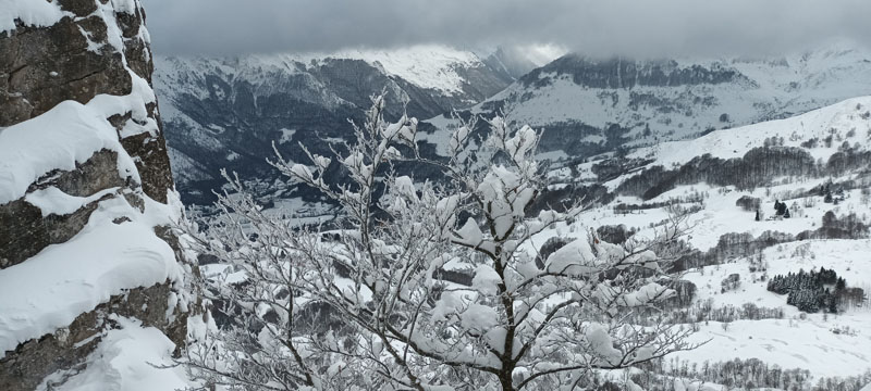 Le paysage de neige est féerique. Les arbres au loin, sont couverts d'apparats de dentelles blanches. Au nord le Soum de Berducou semble un dôme de neige immaculé. Tout au nord au col de Bazes se distinguent des skieurs de fond.