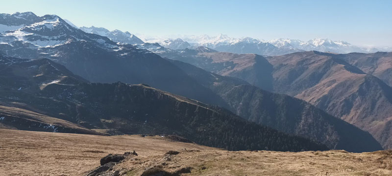 La température est de 6 degrés et va monter dans la journée, toujours au-dessus des normes saisonnières. Le dérèglement climatique se confirme chaque saison! Quelques nuages parcourent le ciel bleu. Le soleil enflamme les cimes.