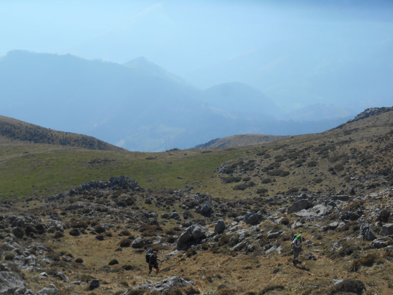 Le soleil éclaire les cimes enneigées à l'est, où l'on distingue le pic Montagnon, le plateau d'Ourdinse, le Ronglet, à l'ouest le pic d'Anie, la Pierre Saint-Martin, les Orgues de Camplong, etc. Arrivés près d'Audap, le cheminement vire en épingle à l'ouest. Par de nombreux lacets il se faufile dans les pentes herbeuses et quelques rochers.