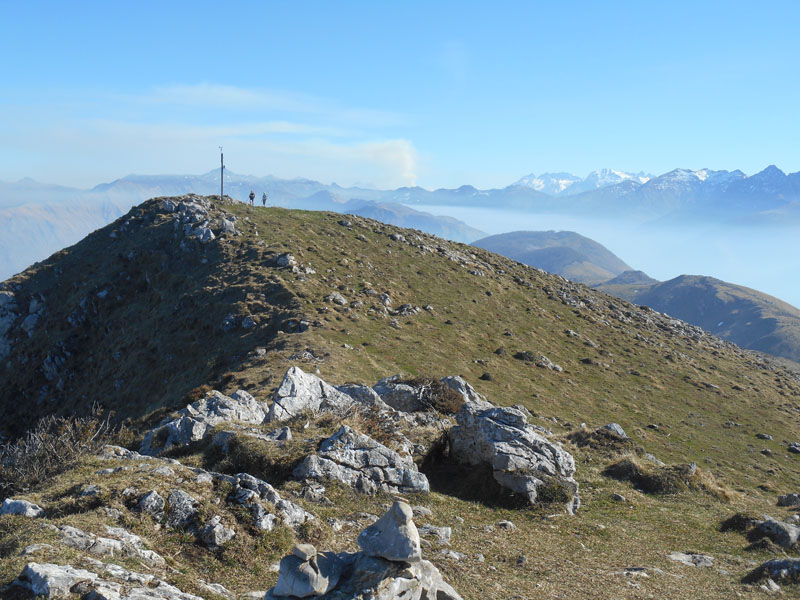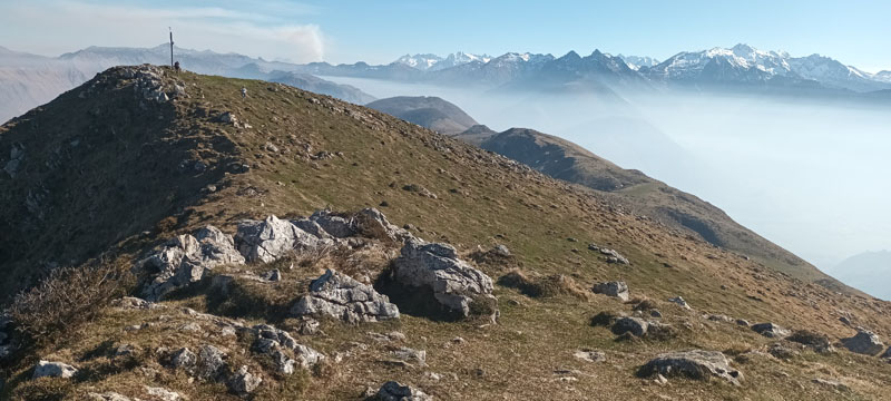 Parvenu sur une crête, les amis suivent ce trajet. Le long de la crête mène à un premier sommet équipé d'une antenne. Au nord les flancs de la crête sont en à-pic. À quelques dizaines de mètres l'autre sommet du Layens porte un énorme cairn et une borne. Il est 13 h, nous déjeunons sous les feux ardents du soleil dans ce splendide panorama où les cimes émergent des brumes et des fumées qui continuent à s'élever, car d'autres pollubuages ont été allumés.