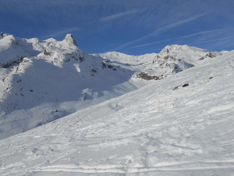 Les peaux retirées des skis, nous nous lançons dans les pentes sud, tout en évitant les combes profondes, surpris par une neige agréable à skier. Parvenus sur le Plaa de la Gradillère, nous remettons les peaux sous les skis et montons direction col de Houer, à l'ouest.