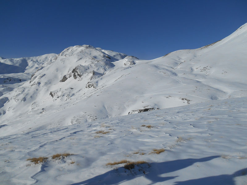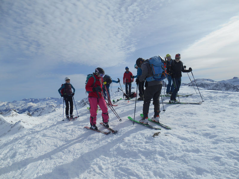Le vallon s'avère long à parcourir. De fait le col est atteint vers midi quarante (2200 m.). Quelques randonneurs en ski ou en raquettes stationnent à cet endroit spacieux. Notre objectif est le sommet dont l'ascension s'effectue ouest, puis sud. C'est ainsi que nous atteignons le pic de Canaourouye à 13 h. Un petit groupe redescend. Trois autres skieurs terminent leur repas. Il fait très bon et nous nous installons pour déjeuner.
