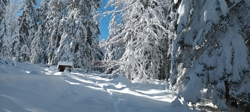 Le cheminement s'élève entre le bois de Riou Tort et la forêt du Différend. Le paysage est féerique. Les sapins couverts de neige tendent leurs branches vêtues de manches de dentelles blanches. Les rayons de soleil leurs offrent des bracelets dorés.