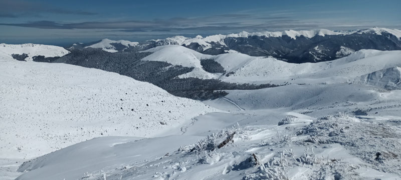 Poursuivant la crête nous atteignons le pic de Crabe où la vue est encore plus vaste coté ouest. Le groupe de skieurs arrivent. Après avoir enlevé les peaux des skis ils repartent aussitôt. De fait le vent froid finit également par nous chasser.
