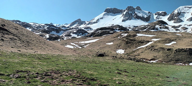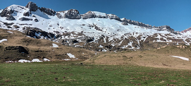 Au-dessus du refuge un énorme rocher offre un point de vue à l'horizon du plateau aux cimes lointaines. Puis nous descendons vers une piste qui mène dans la vallée d'Hecho. Un sentier raide raccourcit la descente le long d'une cascade qui coule ainsi qu'un torrent tumultueux.
