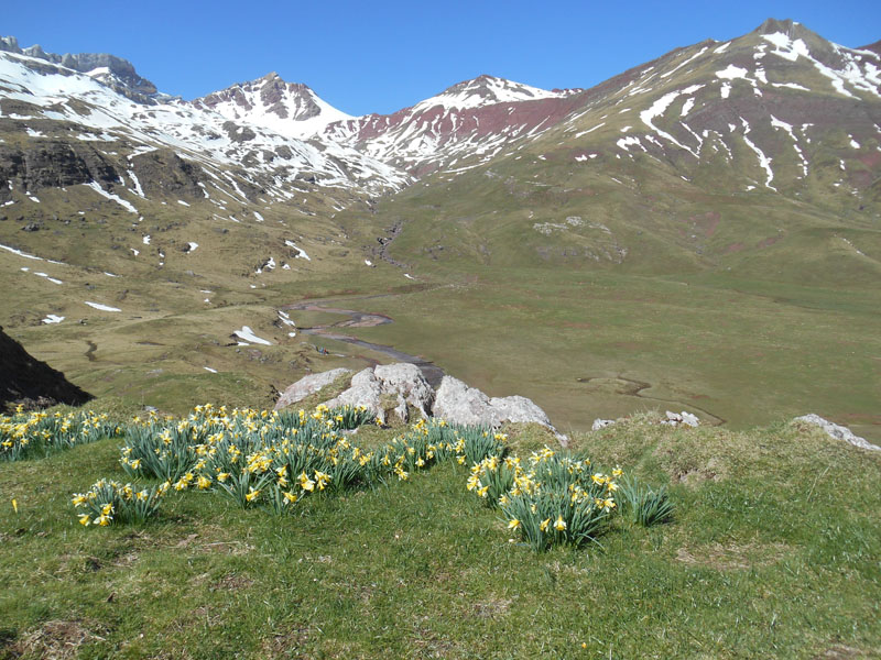 Nous montons sur une butte de quelques dizaines de mètres dominant le plateau d'Aygue-Torte. La vue est superbe avec des bouquets de jonquilles, les cimes blanches se découpant dans l'azur, les rios qui ondulent comme des serpents géants dans le tapis vert du grand plateau.