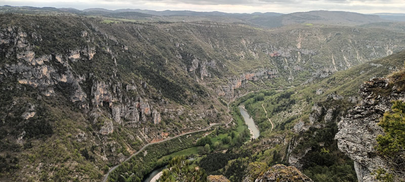 Après le repas, Andrée, Julien, Aurélie, Amandine Grégoire et leurs enfants partent dans le cirque de Baume afin de repérer les voies d'escalade, le temps ne permettant de pratiquer. Pendant ce temps, Yves, Ludovic et moi-même effectuons des petites randonnées par un chemin allant à Roc de Serre. Le terrain est presque plat. Les arbres protègent des rafales de vent. En plusieurs endroits nous dominons les Gorges du Tarn coté La Malène et profitons de la vue.