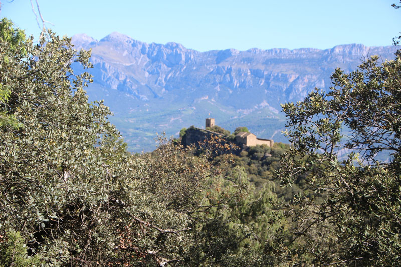 Le cheminement suit une ligne de crête toujours boisé. Des ruines apparaissent parmi les broussailles ainsi que des murets. Sur un point haut légèrement dégagé d'arbres on peut apercevoir la tour du clocher de Muro de Roda et la Peña Montañesa en arrière plan. Après l'ermitage San Cristobal le sentier descend et plus loin remonte. Il contourne des falaises en surplomb. Nous les longeons en passant dessous.De hauts murs de pierres apparaissent, ainsi qu'une bâtisse. C'est Muro de Roda. Nous arrivons devant une haute tour, le clocher de l'église «Ascuncion de Nuestra Señora». Le site est entouré de murailles. La haute porte en bois est ouverte. Nous entrons. De l'église aux maisons en ruines nous longeons les murailles de ce village fortifié.