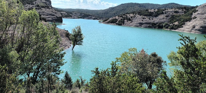 L'ombre des arbres de taille moyenne est appréciée, car le soleil réchauffe de plus en plus l'atmosphère. Lorsque la végétation s'atténue nous apercevons l'immense lac Mediano. De petits panneaux signalent le parcours des VTT. Les ermitages Ministirio, San Cristobal sont signalés mais pas Muro de Roda.