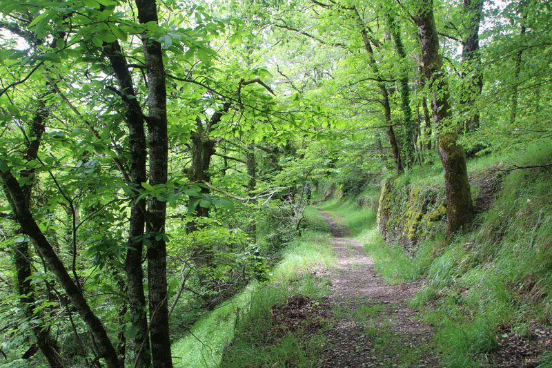 Au sud, à droite un sentier GR 65 descend jusqu'au ruisseau. Puis c'est une remontée qui longe une plantation de châtaigniers qui mène à la rue principale et au parking à 15 h. Retour par la même route. Arrêt dans un bar à Entraygues sur Tuyère pour déguster une boisson et visiter une cave à vin.